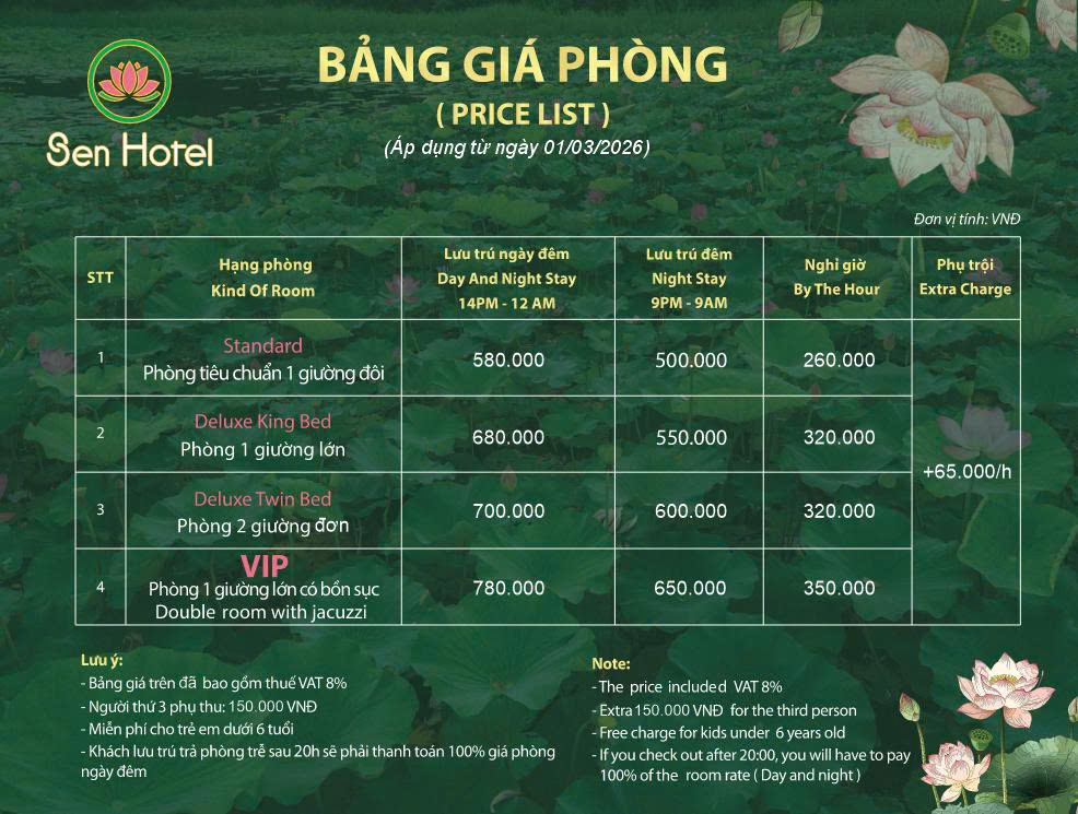 Sen Hotel mang đến mức giá vô cùng cạnh tranh, phù hợp với cả khách đi công tác, cặp đôi, nhóm bạn và gia đình: